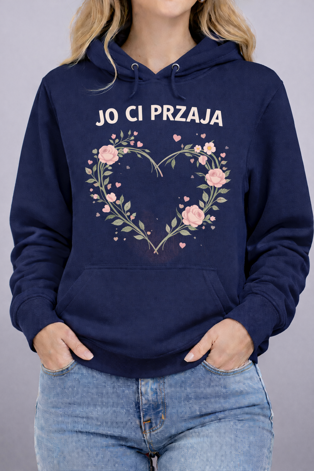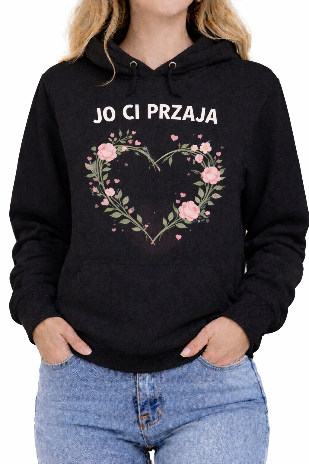 bluza Jo ci przaja, bluza śląska damska, bluza romantyczna, bluza z sercem, bluza z napisem śląskim, prezent dla dziewczyny, bluza walentynkowa, bluza z kapturem damska, bluza regionalna śląska, śląska godka odzież, bluza na rocznicę, bluza casual damska