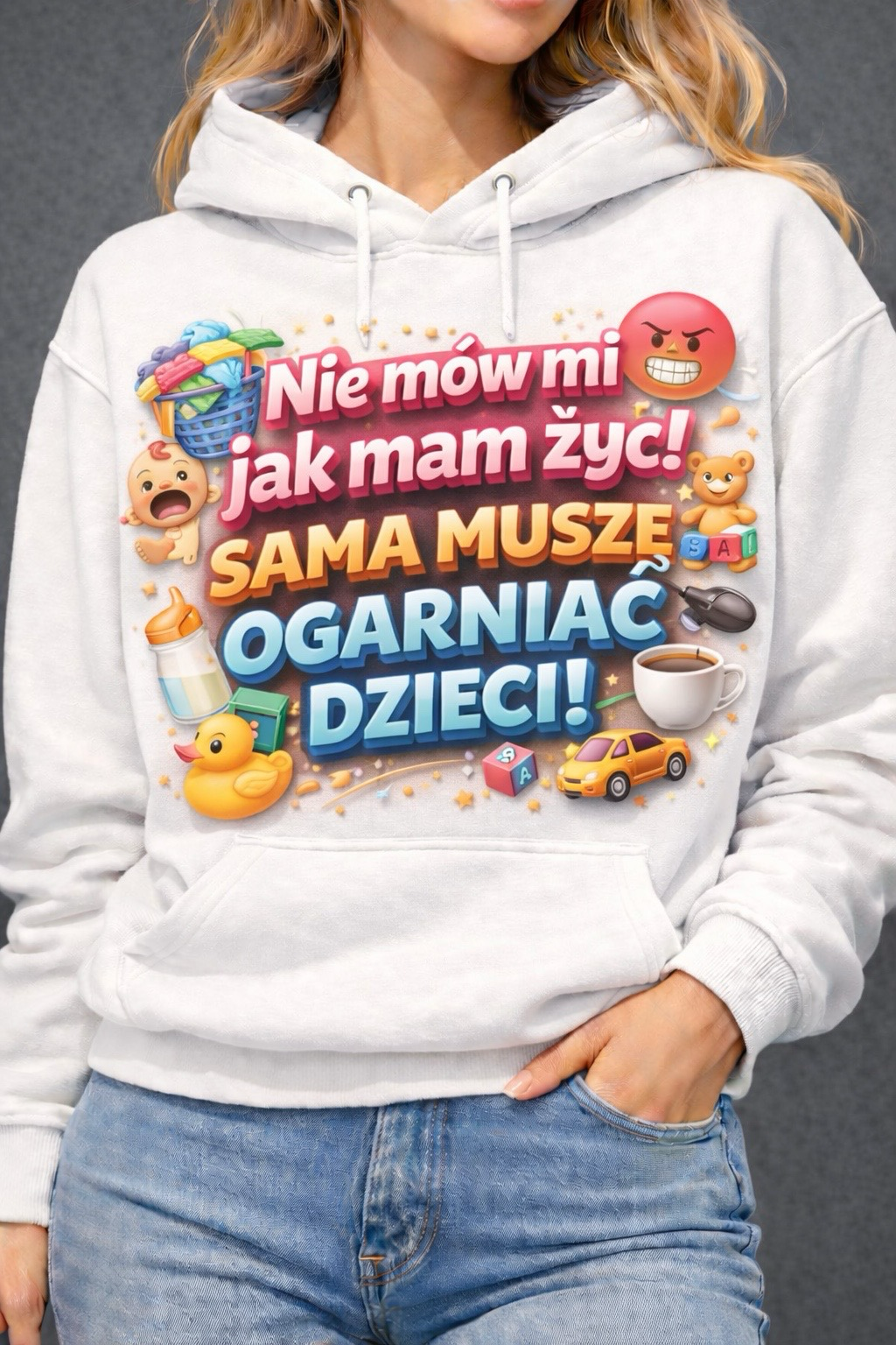 Macierzyństwo to chaos, miłość i… ogromne poczucie humoru 😅 Bluza z napisem „Nie mów mi jak mam żyć! Sama muszę ogarniać dzieci!” to idealny wybór dla każdej mamy, która ma dość dobrych rad i doskonale wie, jak wygląda codzienność z dziećmi 👶🍼🚗☕