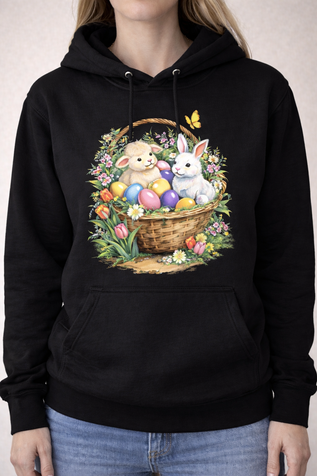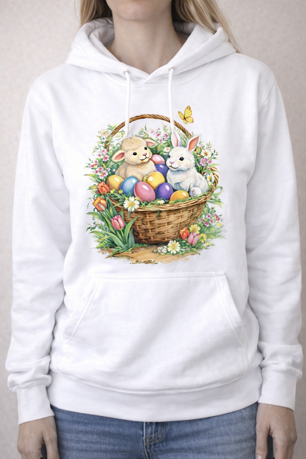 Poczuj prawdziwy klimat Świąt Wielkanocnych 🐣 dzięki wyjątkowej bluzie z kapturem z uroczym, bogatym w detale nadrukiem. Ilustracja przedstawia wielkanocny koszyczek pełen kolorowych pisanek, słodkiego zajączka 🐰, baranka 🐑 oraz wiosenne kwiaty 🌷 – wszystko w ciepłej, radosnej stylistyce, która od razu wprowadza świąteczny nastrój ✨