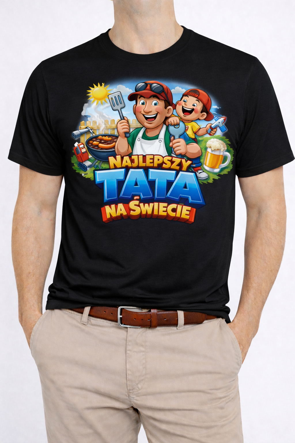 Koszulka męska „Najlepszy Tata na świecie” to idealne połączenie humoru, rodzinnego klimatu i dumy z bycia tatą. Kolorowy nadruk z uśmiechniętym tatą przy grillu i dzieckiem u boku doskonale oddaje codzienne, najlepsze chwile spędzane razem 🎁