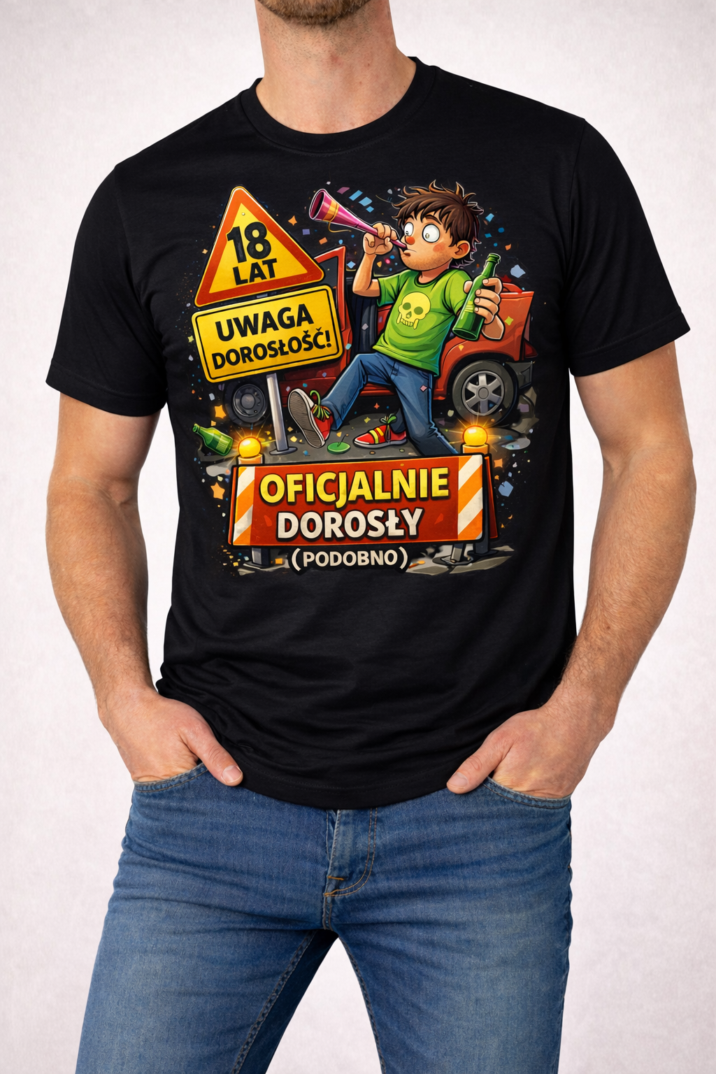 Koszulka męska „Oficjalnie dorosły (podobno)” – 18 lat