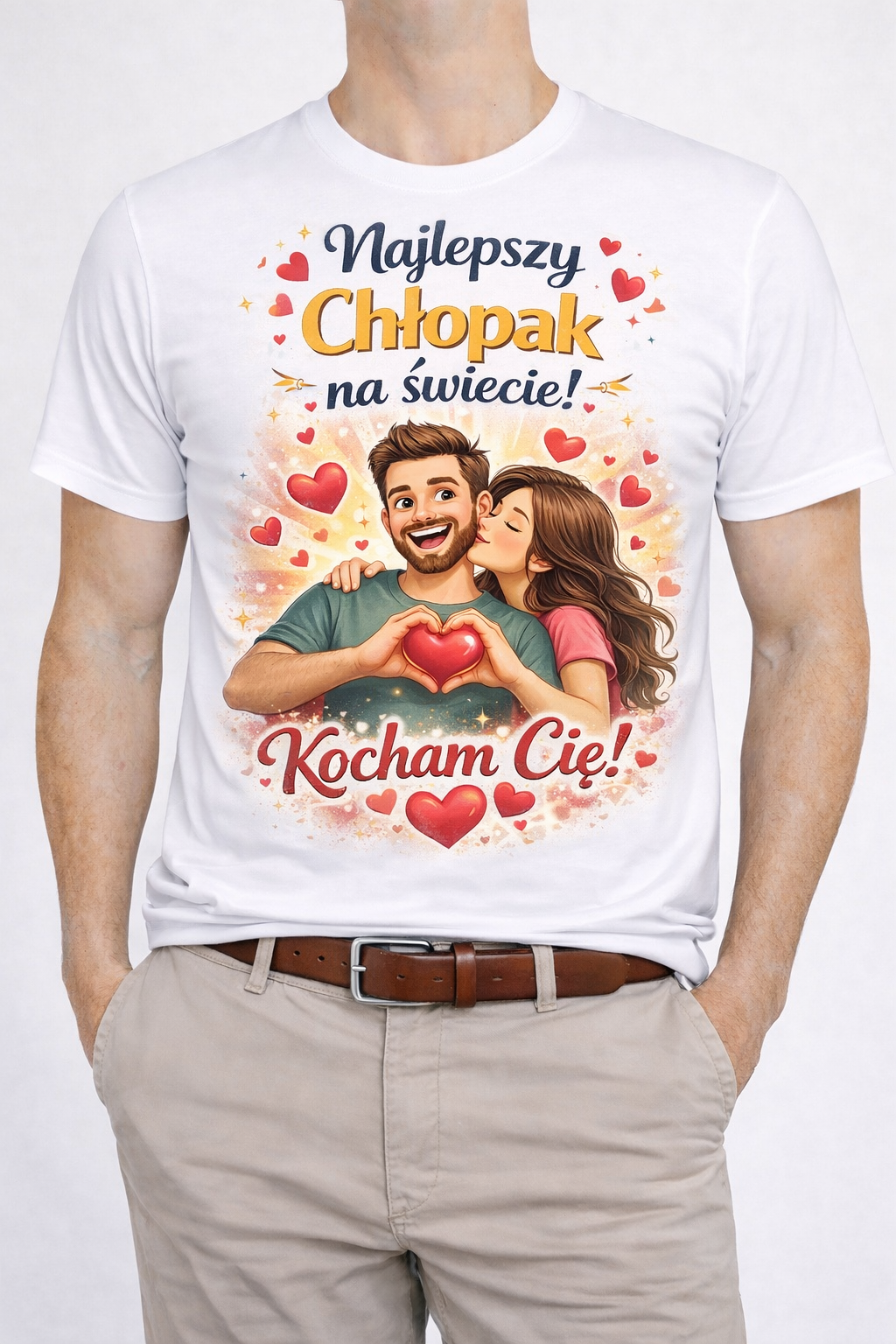 Romantyczna koszulka męska z nadrukiem „Najlepszy Chłopak na świecie! Kocham Cię” to idealny prezent dla ukochanego. Wysokiej jakości bawełna zapewnia komfort noszenia, a trwały nadruk zachowuje intensywne kolory nawet po wielu praniach. Doskonała na Walentynki, rocznicę, urodziny lub Dzień Chłopaka. Wyraź miłość w stylowy sposób ❤️