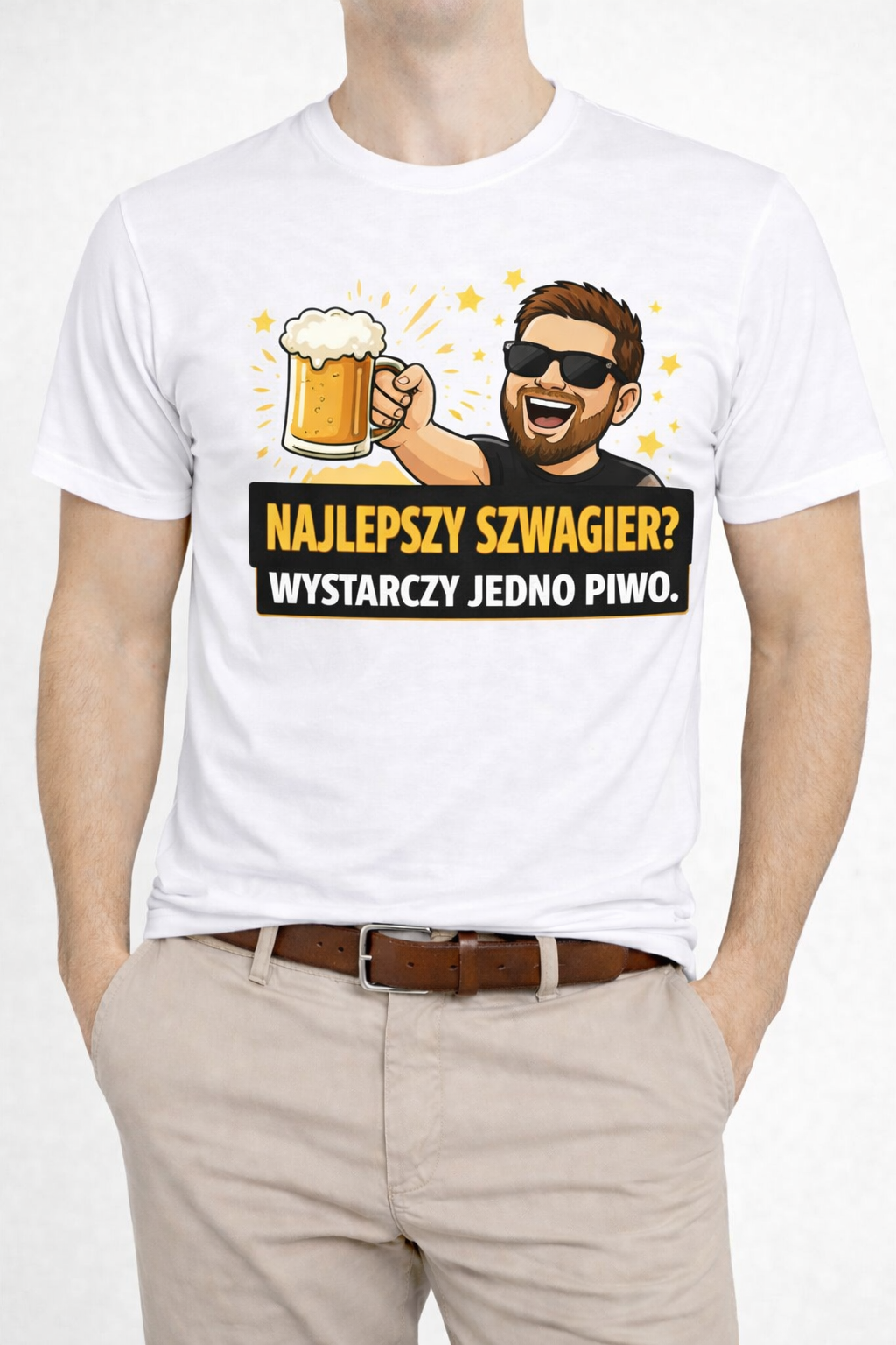 Koszulka z nadrukiem „Najlepszy Szwagier? Wystarczy Jedno Piwo” to humorystyczna propozycja dla osób, które lubią żartobliwe hasła i luźny styl. Wyrazisty napis w połączeniu z zabawną grafiką podkreśla dystans do siebie i świetnie oddaje klimat nieformalnych spotkań w gronie rodziny lub znajomych. Koszulka doskonale sprawdzi się na co dzień, podczas spotkań towarzyskich oraz jako oryginalny prezent dla szwagra.