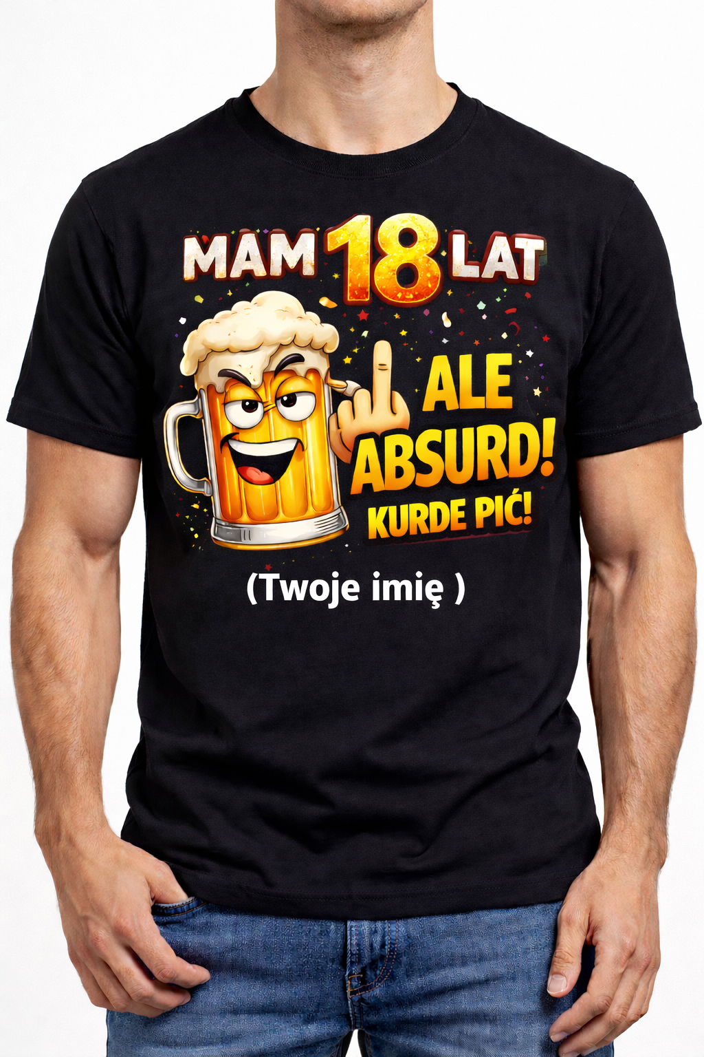 Koszulka „Mam 18 lat – Ale absurd, kurde pić!” to idealna propozycja na osiemnastkę z humorem i charakterem 🎉