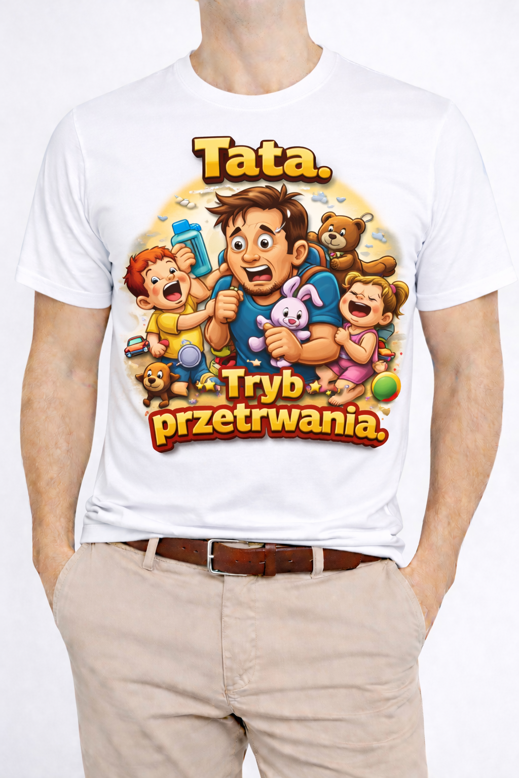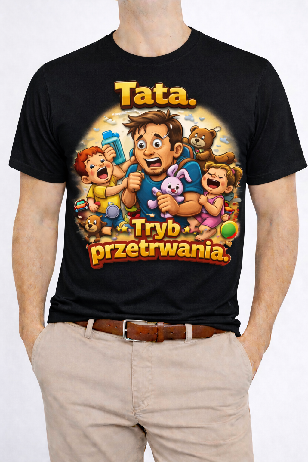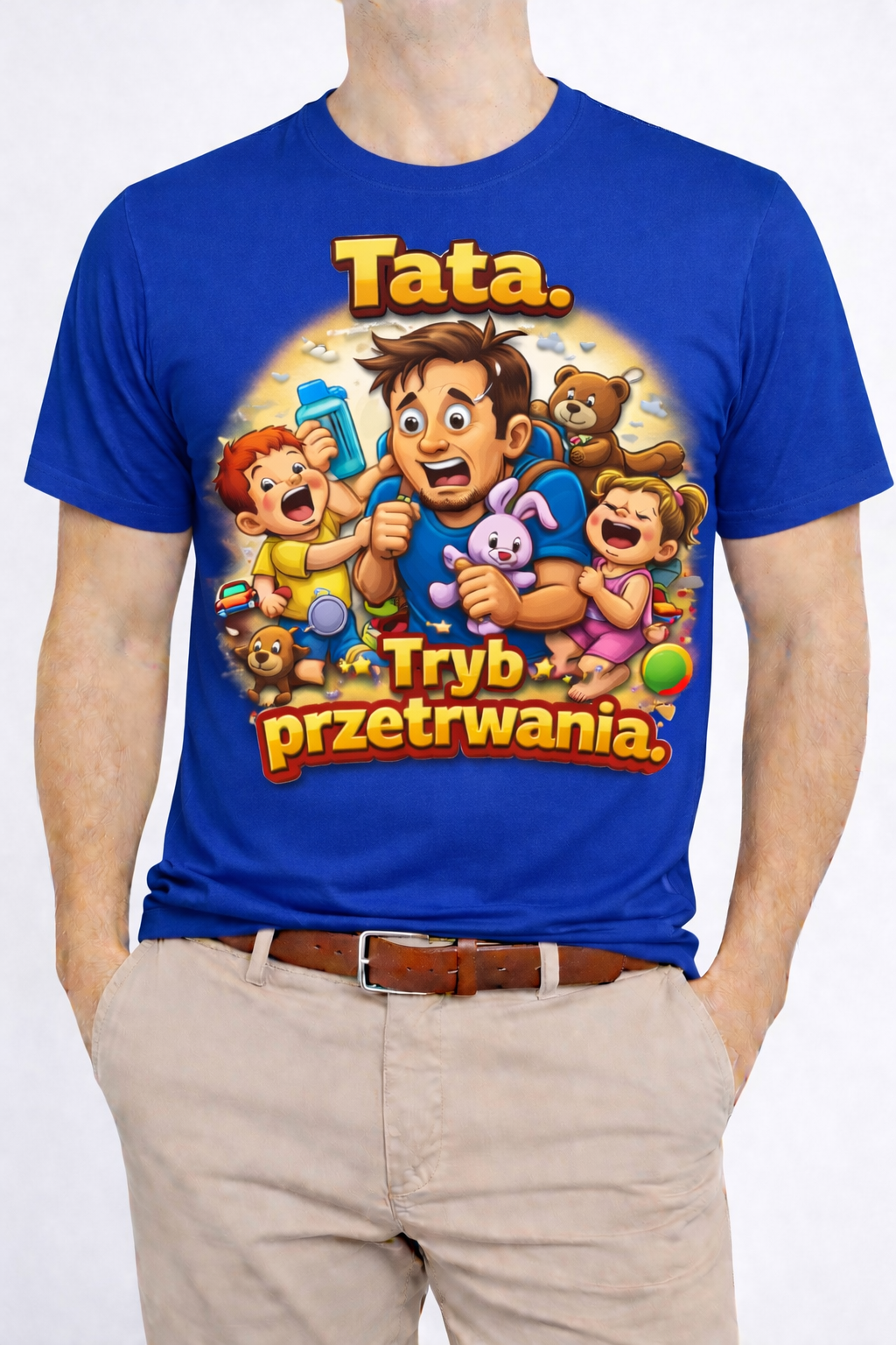 Bycie tatą to nie lada wyzwanie – a ta koszulka mówi o tym wszystko. „Tata. Tryb przetrwania.” to humorystyczny, a jednocześnie bardzo życiowy motyw, który doskonale oddaje codzienność każdego ojca. Krzyki, zabawki, brak snu i niekończąca się energia dzieci – a tata nadal stoi na posterunku.