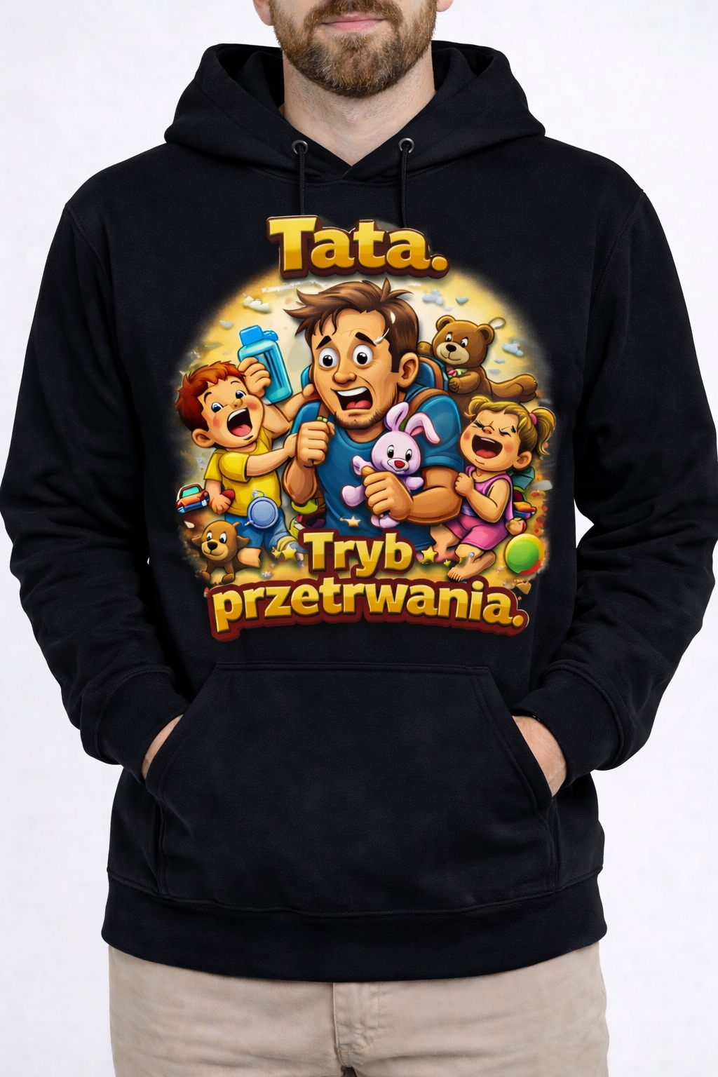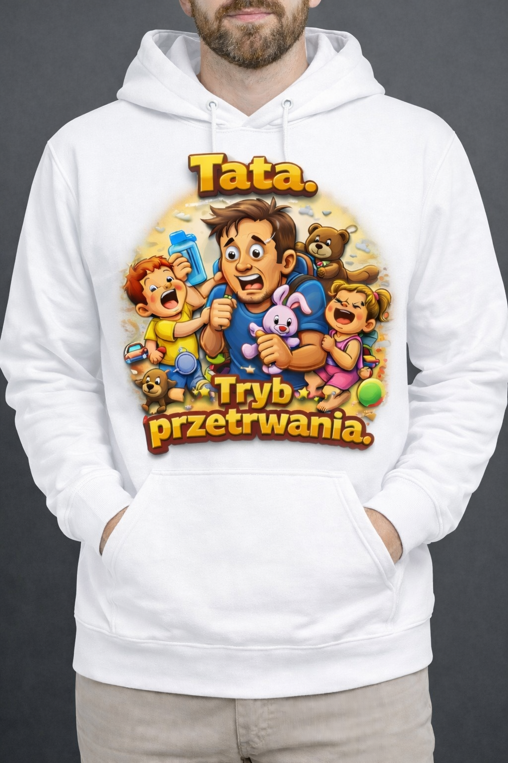 Zabawna bluza z kapturem „Tata. Tryb przetrwania” to idealny wybór dla każdego ojca, który każdego dnia ogarnia rodzinny chaos 💪😂 Komfortowa, ciepła i pełna humoru – doskonała na prezent 🎁